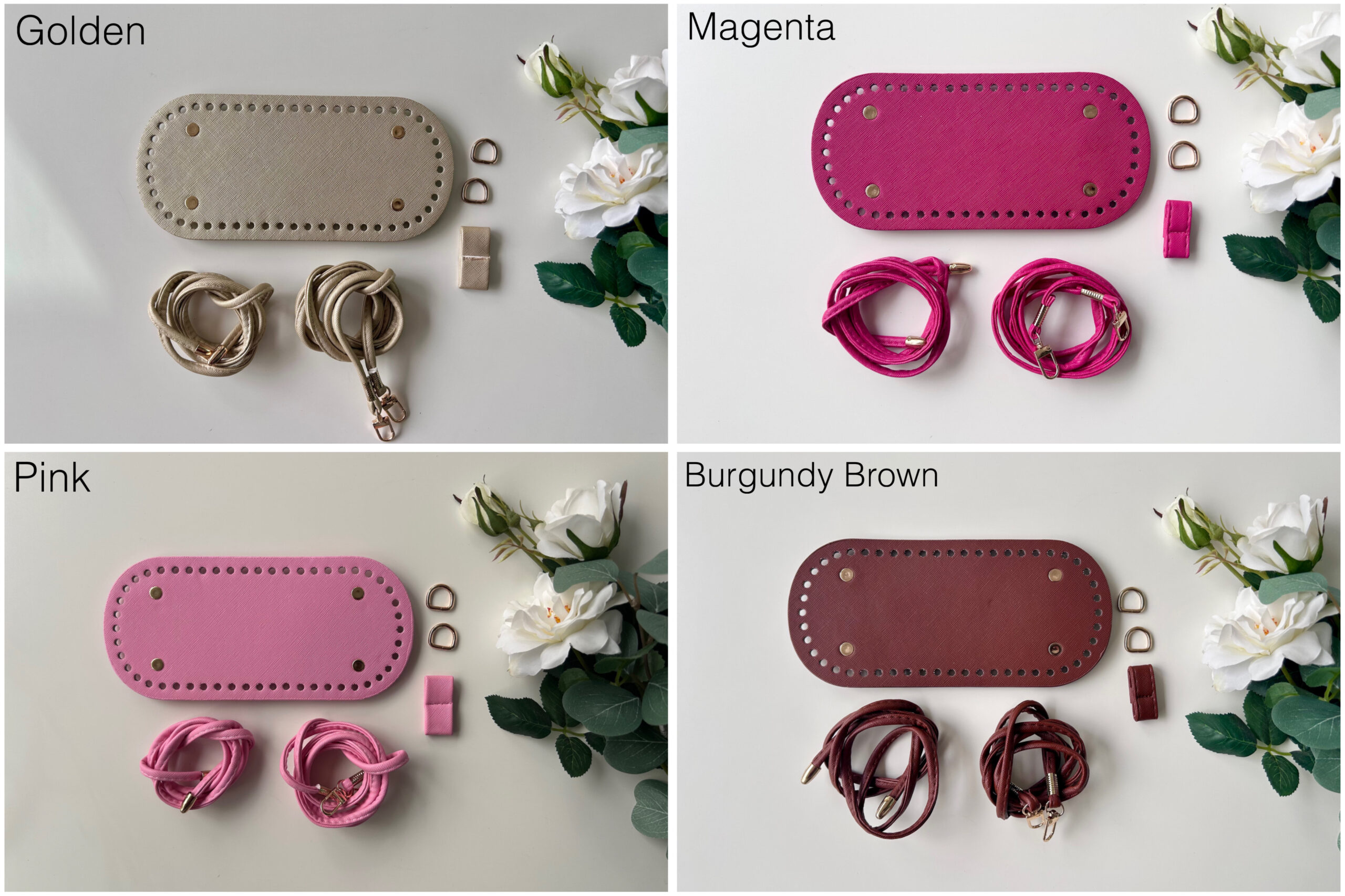 All-in-one PU leather DIY kit for making a stylish knitting sling bag. Includes base, long strap with hook, push lock, tightening strap, loops, and metal rings—ideal for DIY bag makers and crafters.